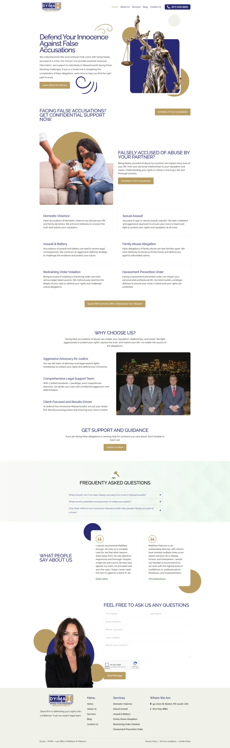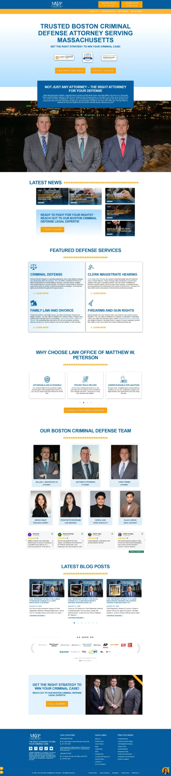 I managed website development and maintenance for multiple sites under the Law Office of Matthew W. Peterson, including revamping the Massachusetts website, creating the New Hampshire website, developing defendyourinnocence.com, and website form into CRM integration. My work focused on improving design, functionality, and performance while ensuring consistent branding across all platforms.